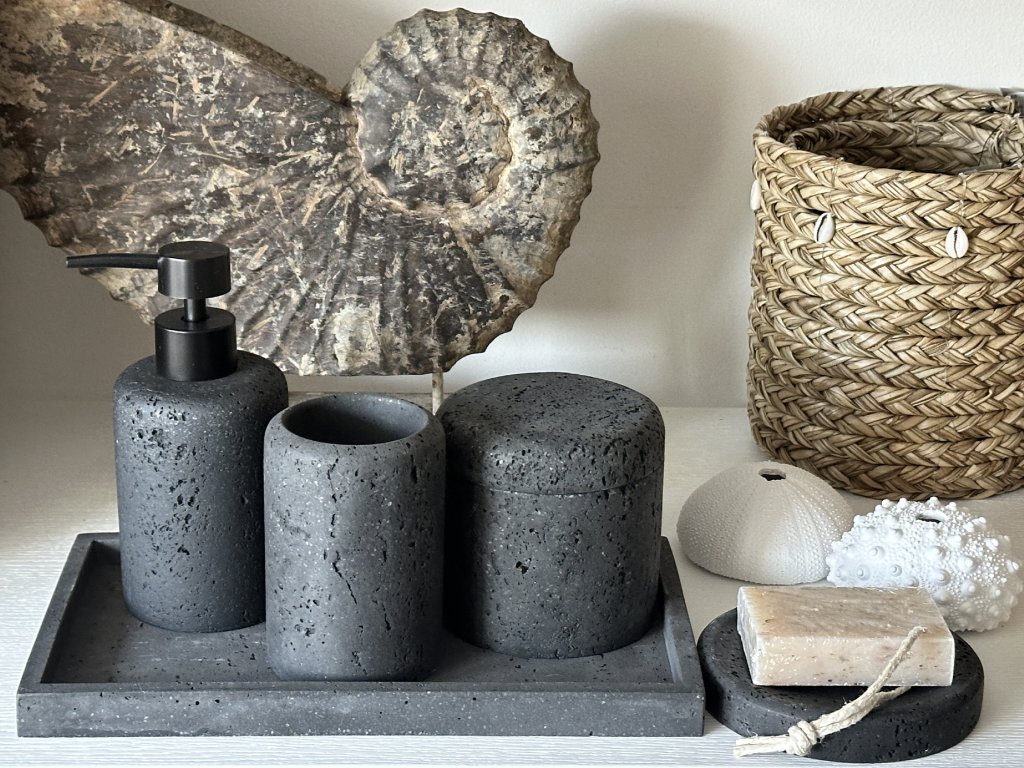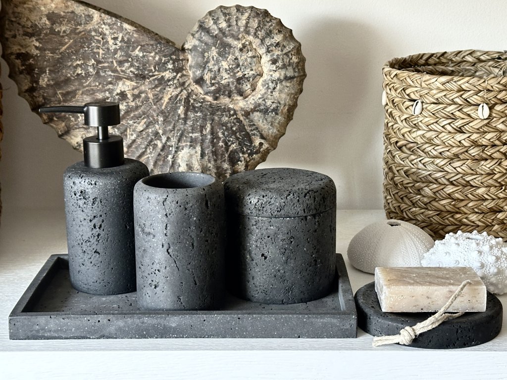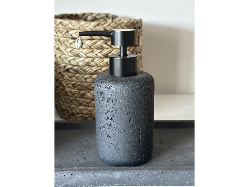 Elegantní dávkovač na mýdlo z kameniny v matném černém odstínu s jemnou strukturou. Minimalistický tvar a přírodní vzhled krásně doplní koupelnu i kuchyň v moderním i přírodním stylu.