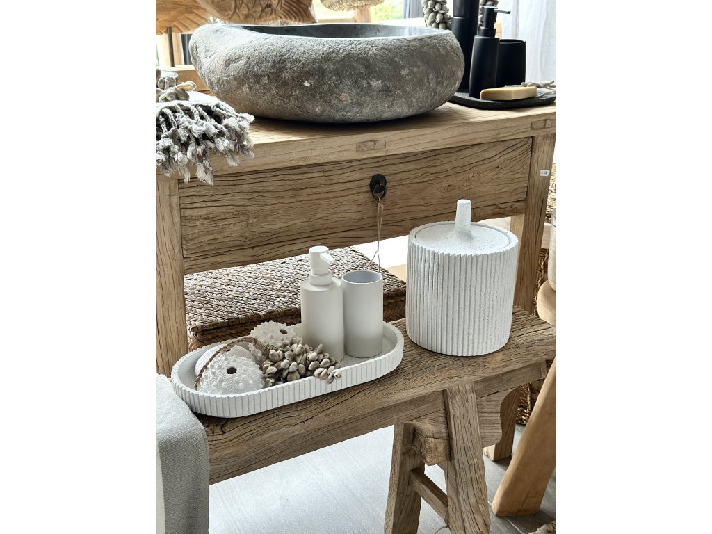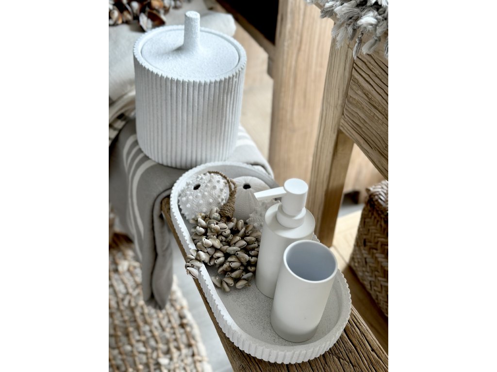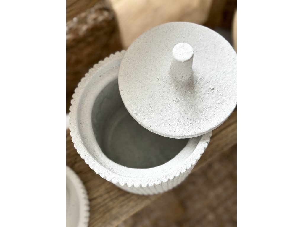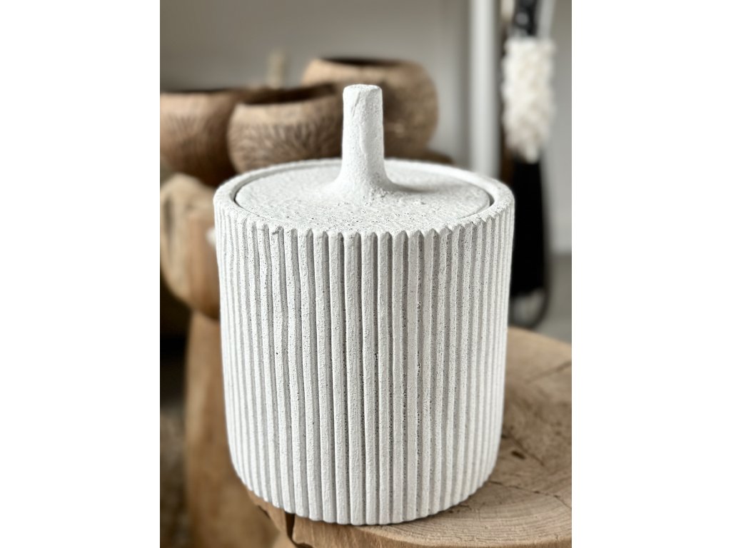 Minimalistická keramická dóza v světlém, přirozeném tónu. Čistý válcovitý tvar doplňuje jemné vertikální rýhování, které dodává povrchu strukturu a klidný rytmus. Víčko s jednoduchým úchytem podtrhuje celkovou střídmost a nadčasový vzhled.