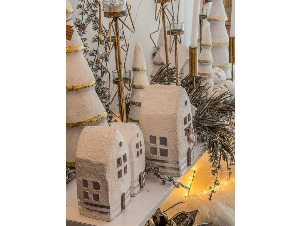 Jemné dekorativní domečky z papírmaše v přírodním bílém odstínu působí útulně a hřejivě. Po vložení světýlka se rozzáří měkkým světlem a vytvoří krásnou zimní atmosféru, ideální pro adventní období i celoroční zútulnění interiéru.