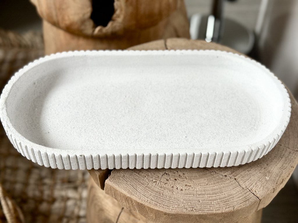 Minimalistický keramický podnos v jemném světlém odstínu. Čistý tvar doplňuje decentní vertikální rýhování po obvodu, které dodávají strukturu a eleganci. Matný povrch působí přirozeně a nadčasově.
