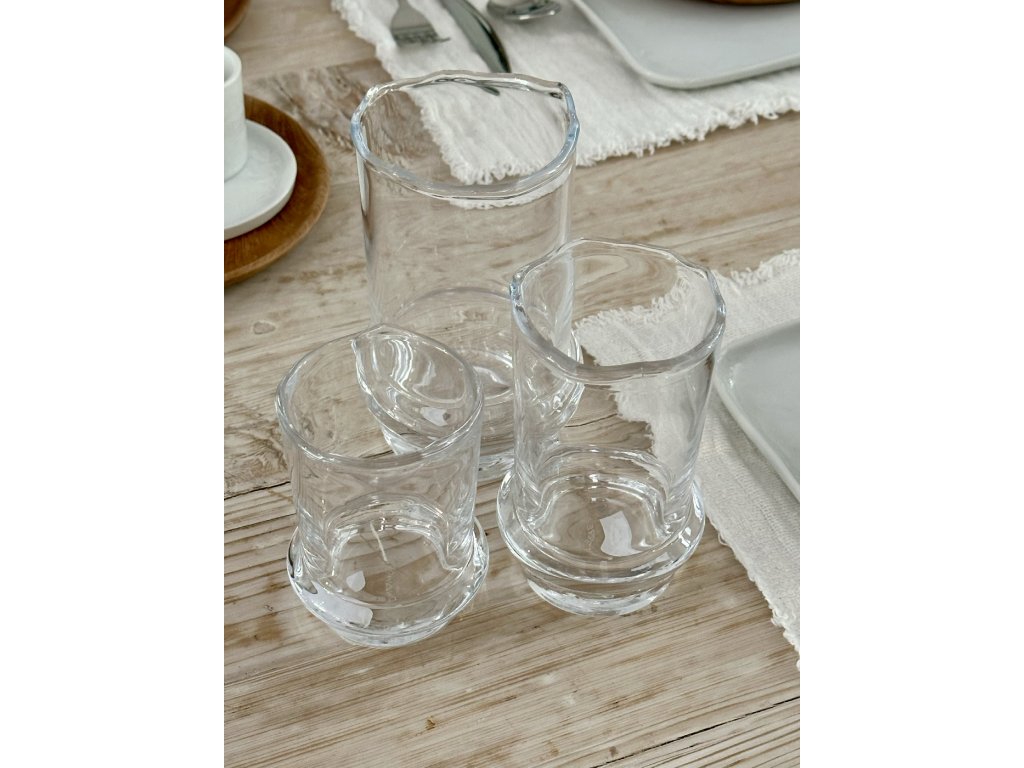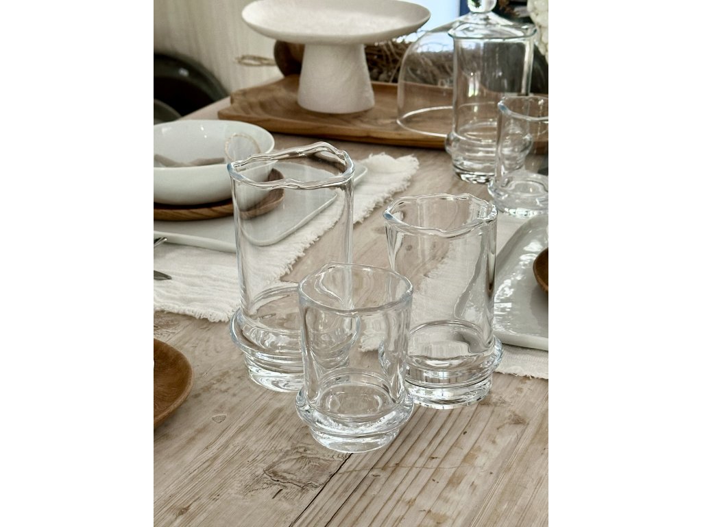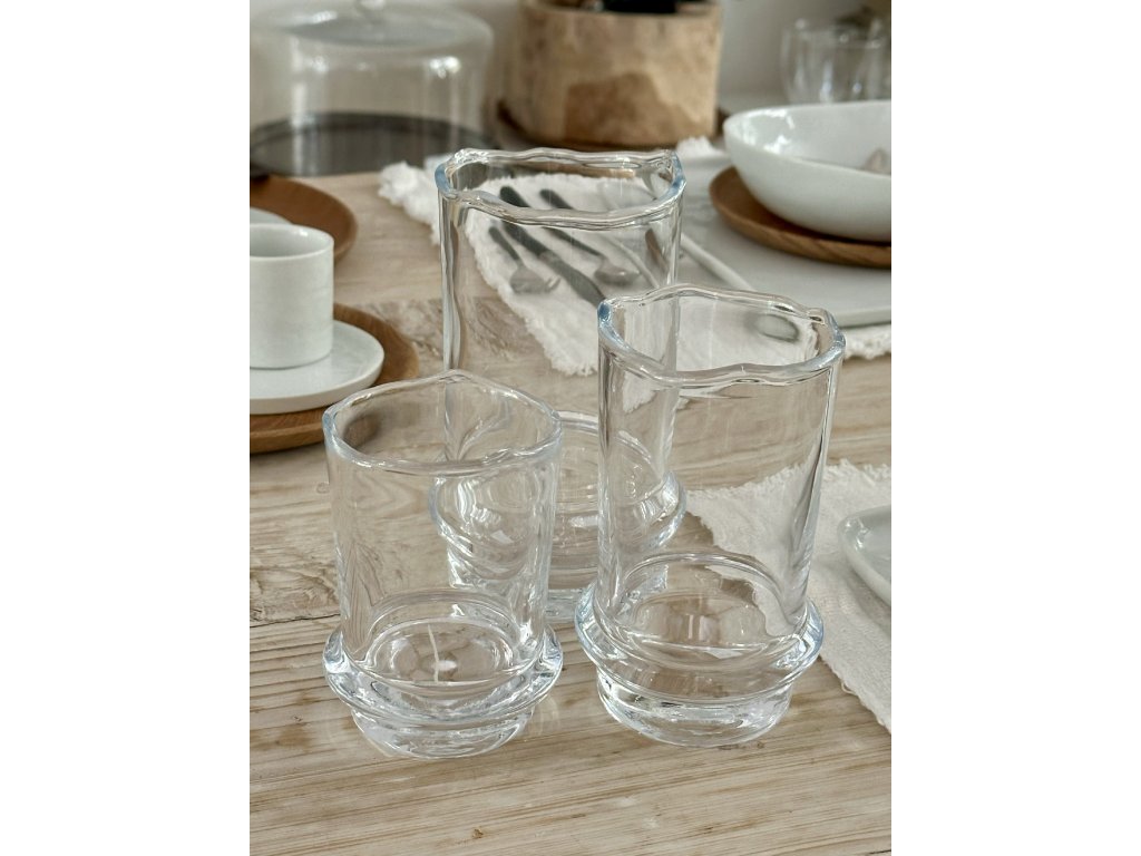 Ručně foukané sklenice z čirého, silnostěnného skla s originálním zvlněným okrajem. Každý kus je jedinečný díky ruční výrobě. Vhodné pro servírování vody, džusů, koktejlů či jiných nápojů. Nadčasový design a kvalitní provedení dodají stolování jedinečný šmrnc, ať už při každodenním používání nebo slavnostních příležitostech.