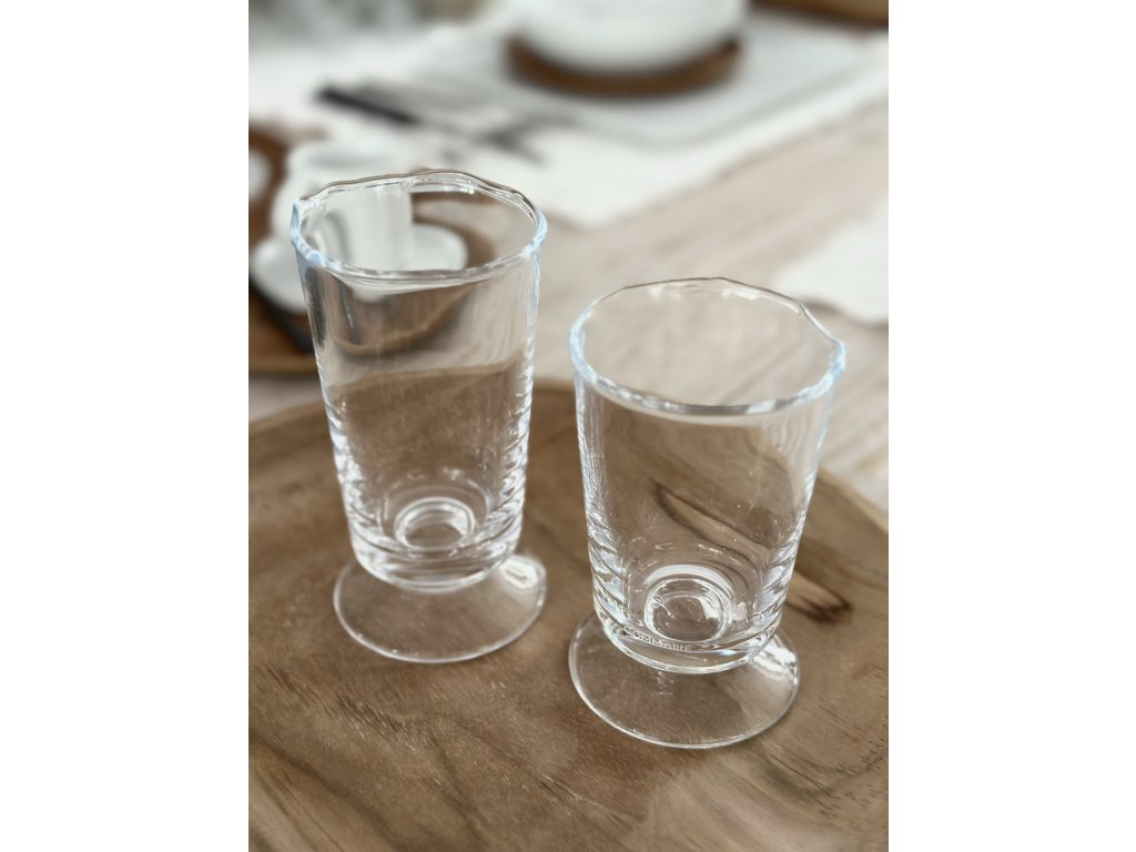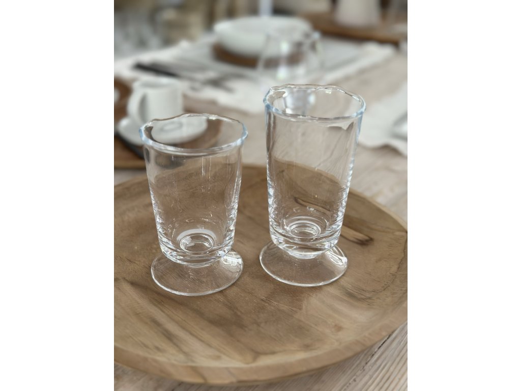 Ručně foukané sklenice z čirého, silnostěnného skla s originálním zvlněným okrajem. Každý kus je jedinečný díky ruční výrobě. Vhodné pro servírování vody, džusů, koktejlů či jiných nápojů. Nadčasový design a kvalitní provedení dodají stolování jedinečný šmrnc, ať už při každodenním používání nebo slavnostních příležitostech.