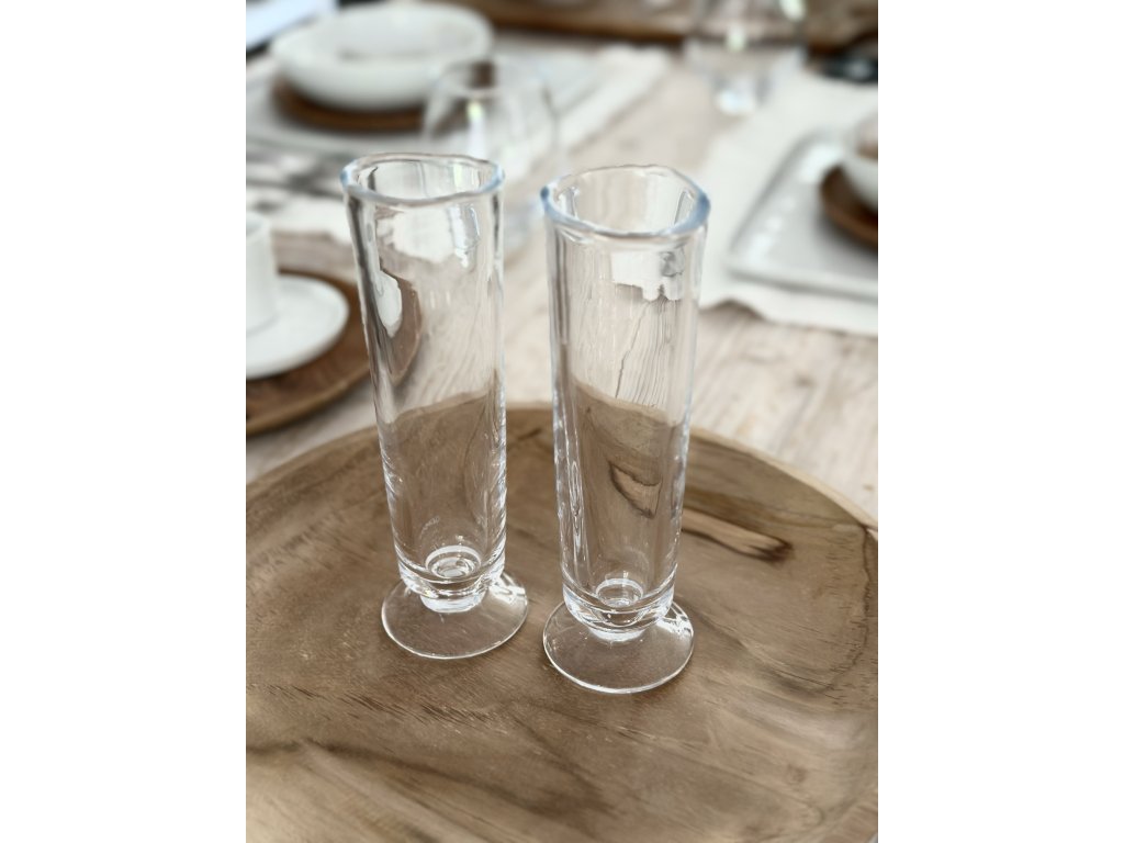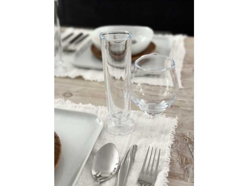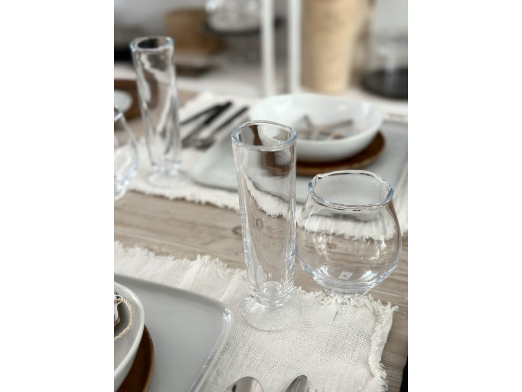 Ručně foukané sklenice na sekt z čirého, silnostěnného skla s originálním zvlněným okrajem. Každý kus je jedinečný díky ruční výrobě. Nadčasový design a kvalitní provedení dodají stolování jedinečný šmrnc, ať už při každodenním používání nebo slavnostních příležitostech.