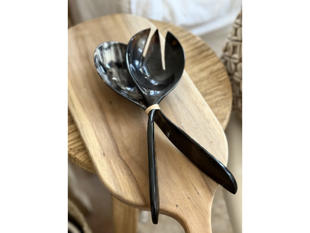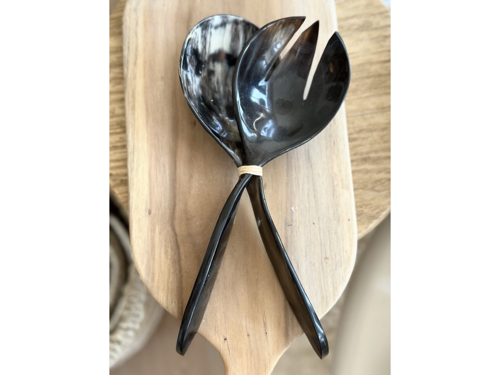 Elegantní sada servírovací vidličky a lžíce z leštěného buvolího rohu. Každý kus je originál s jedinečnou kresbou a barevnými odstíny, které se pohybují od jemné krémové po hlubokou černou. Lehký, ale pevný materiál dodá stolování luxusní a exotický nádech.