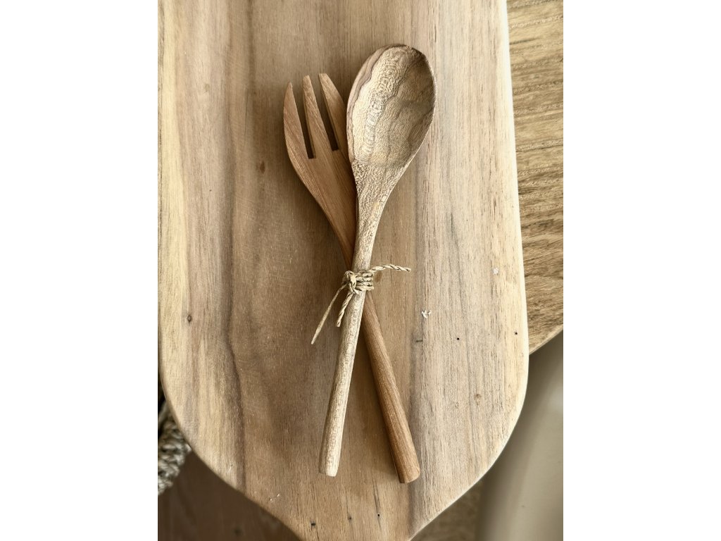 Sada servírovací vidličky a lžíce z teakového dřeva – ideální pro stylové podávání různých omáček či grilované zeleniny... Ručně vyrobené kusy vynikají jedinečnou kresbou dřeva a přírodním vzhledem, který dodá stolování hřejivý nádech.