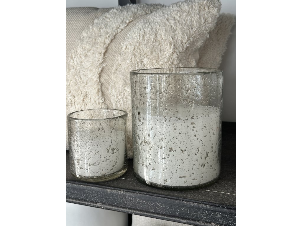 Dekorativní svíčka ve skleněné nádobě s jemnou patinou a drobnými bublinkami ve skle, které jí dodávají přirozený, lehce vintage vzhled.