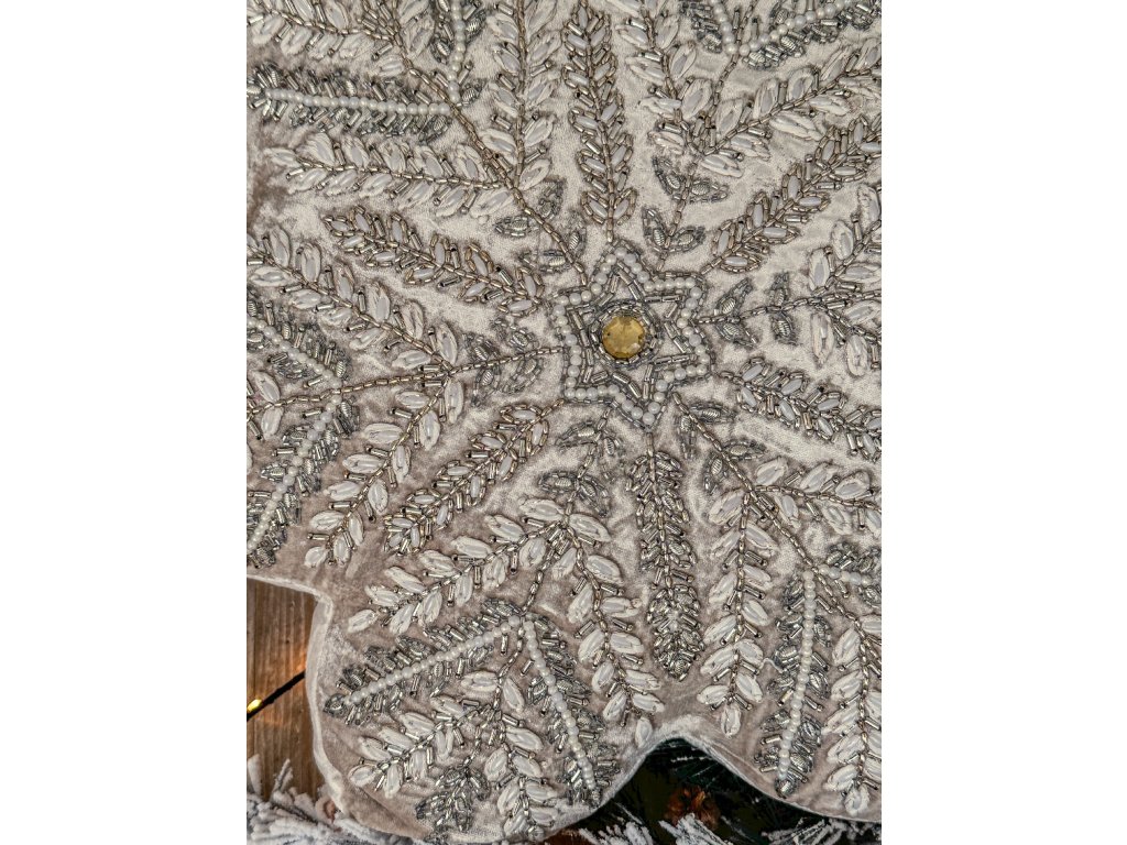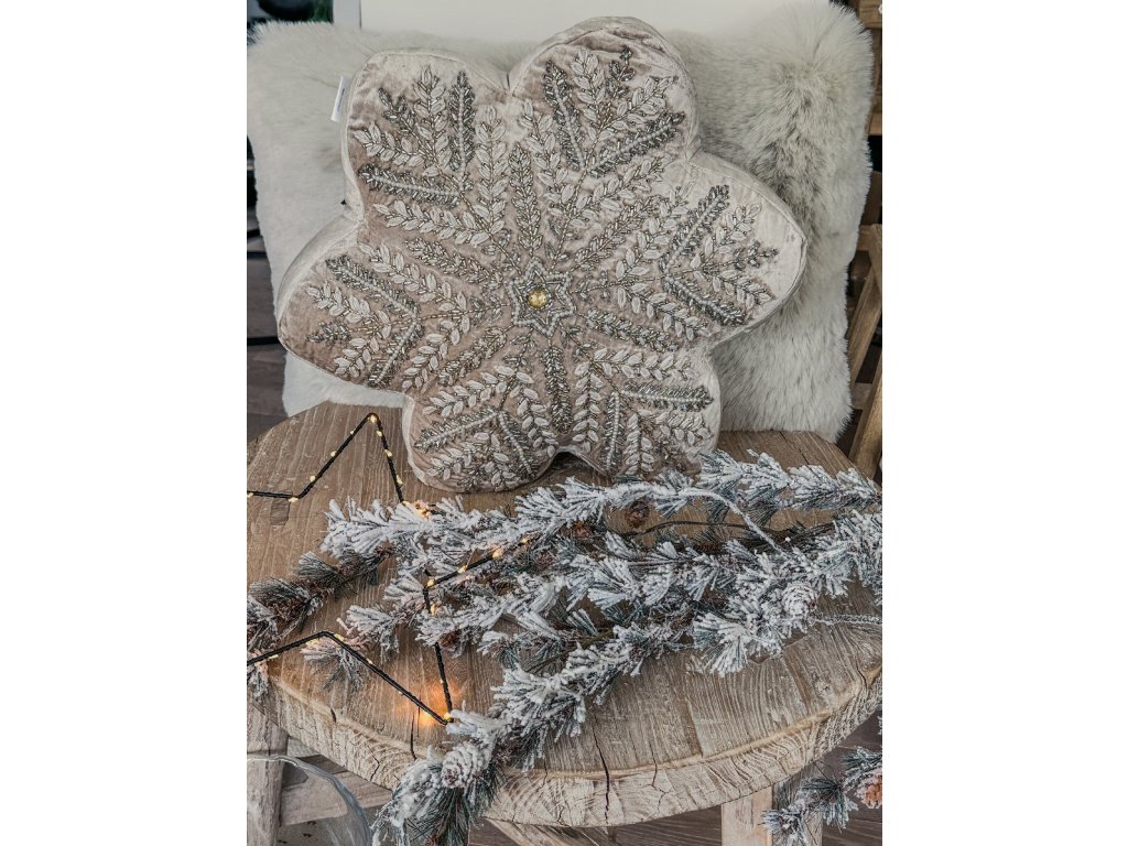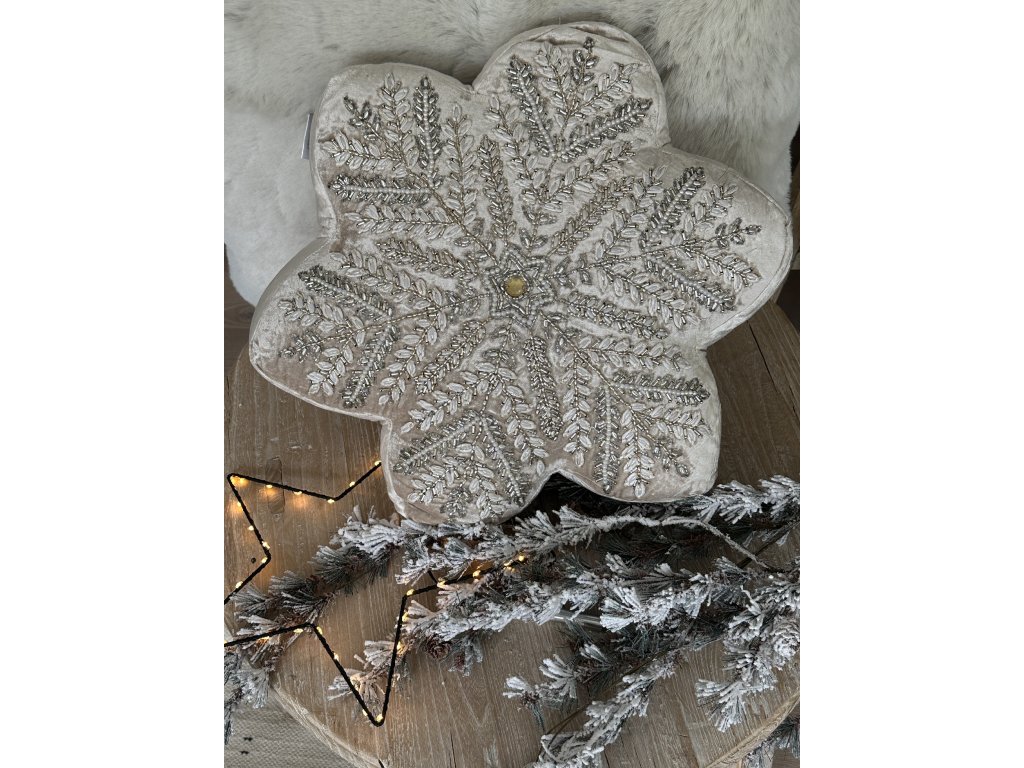Jemný krémový polštář s ruční výšivkou vánočních motivů ve tvaru hvězdy vnese do interiéru kouzlo klidných svátků. Kombinace stříbrných perliček, vyšívaných lístků a decentního lesku působí elegantně a přitom přirozeně.
