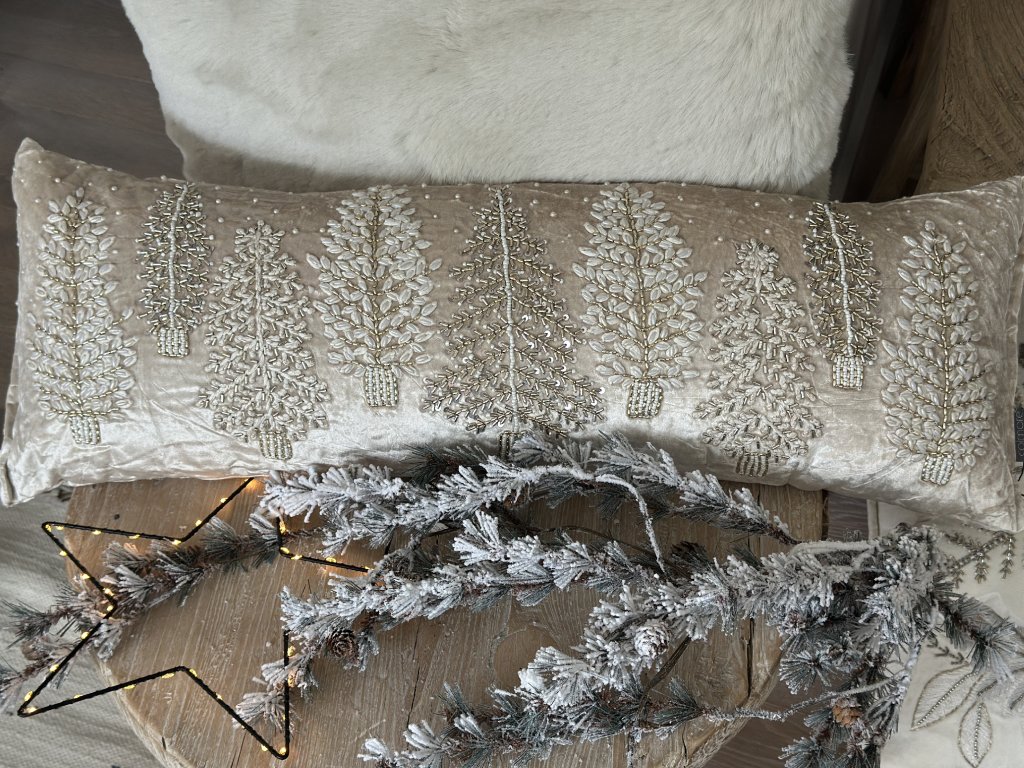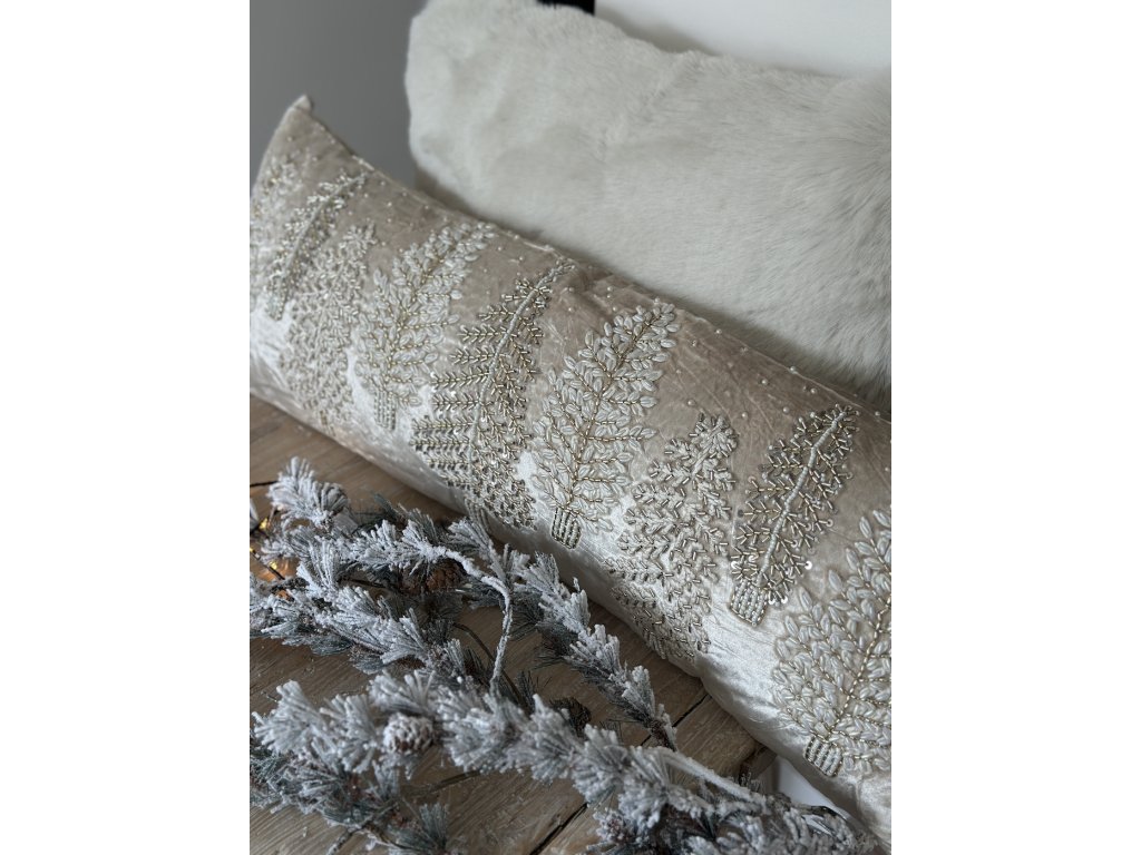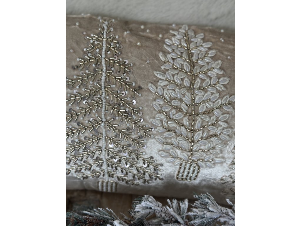 Jemný sametový polštář se zlatou a stříbrnou korálkovou výšivkou stromků, dodá interiéru slavnostní nádech a teplé zimní kouzlo.V decentních tónech béžové a zlaté působí elegantně.