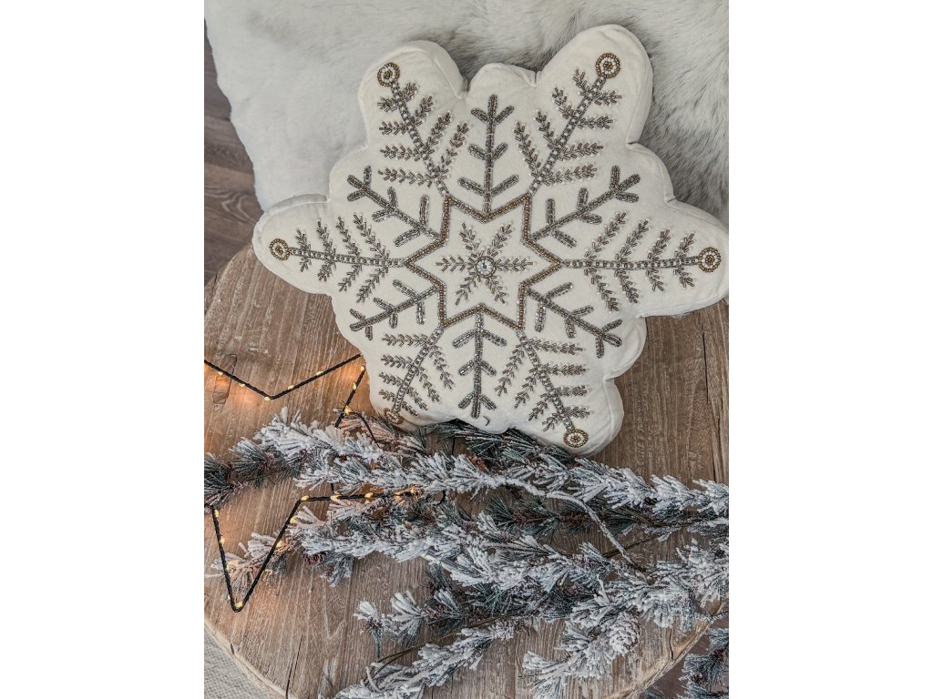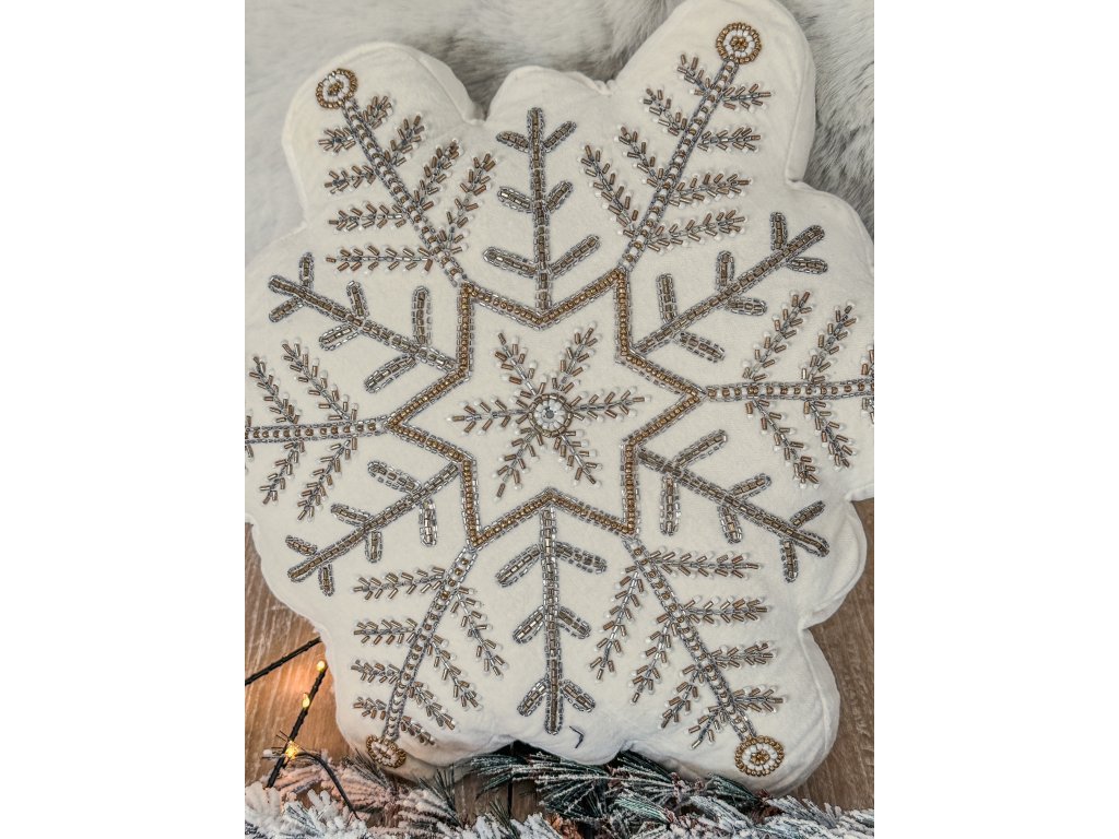 Jemný krémový polštář s ruční výšivkou vánočních motivů ve tvaru vločky, vnese do interiéru kouzlo klidných svátků. Kombinace stříbrných perliček, vyšívaných lístků a decentního lesku působí elegantně a přitom přirozeně.
