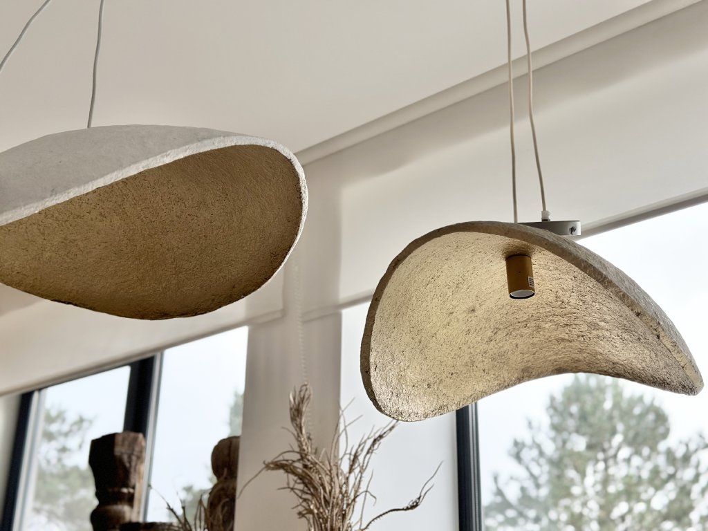 Designové závěsné svítidlo z papírmaše s výrazným obloukovým tvarem inspirovaným přírodními liniemi. Strukturovaný povrch v jemných zemitých tónech vytváří měkké, tlumené světlo a dodává prostoru klidnou atmosféru.