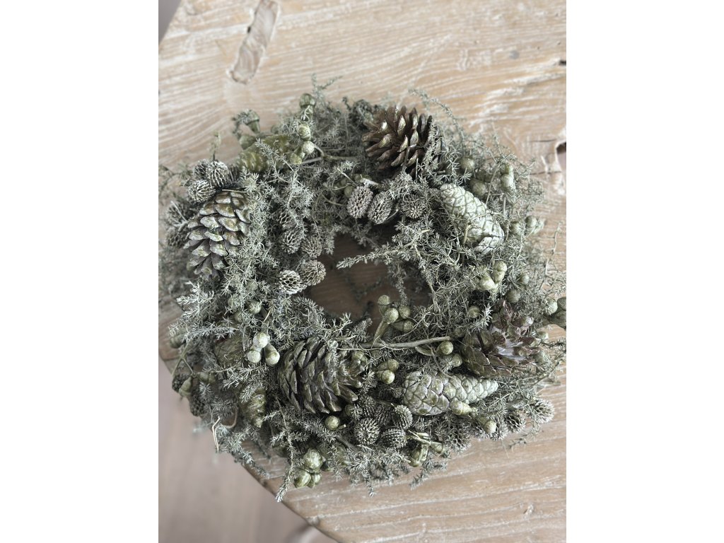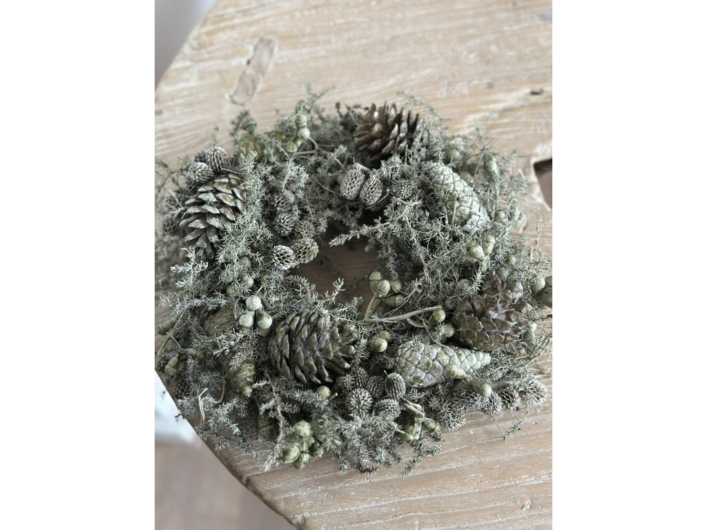 Zimní přírodní věnec plný šišek a jemné zeleně, který vnese kousek lesního kouzla do vašeho domova. Ideální na stůl, na dveře nebo jen tak na poličku pro přirozeně útulnou atmosféru.